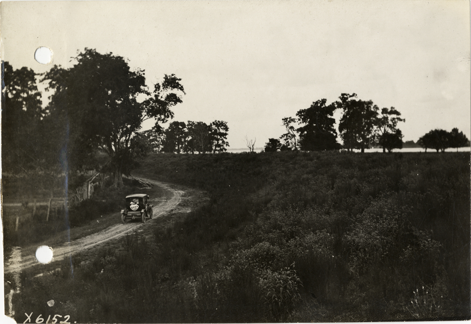 Rear view of Flanders electric car traveling along Mississippi River levee during the pathfinding expedition for the 1912 Glidden Tour. The pathfinding tour covered a route from Detroit, Michigan to New Orleans, Louisiana, but the 1912 Glidden Tour was canceled. Handwritten on back: "Pathfinder along the Mississippi levee, 1912. Tours--Glidden Tour, 1912."