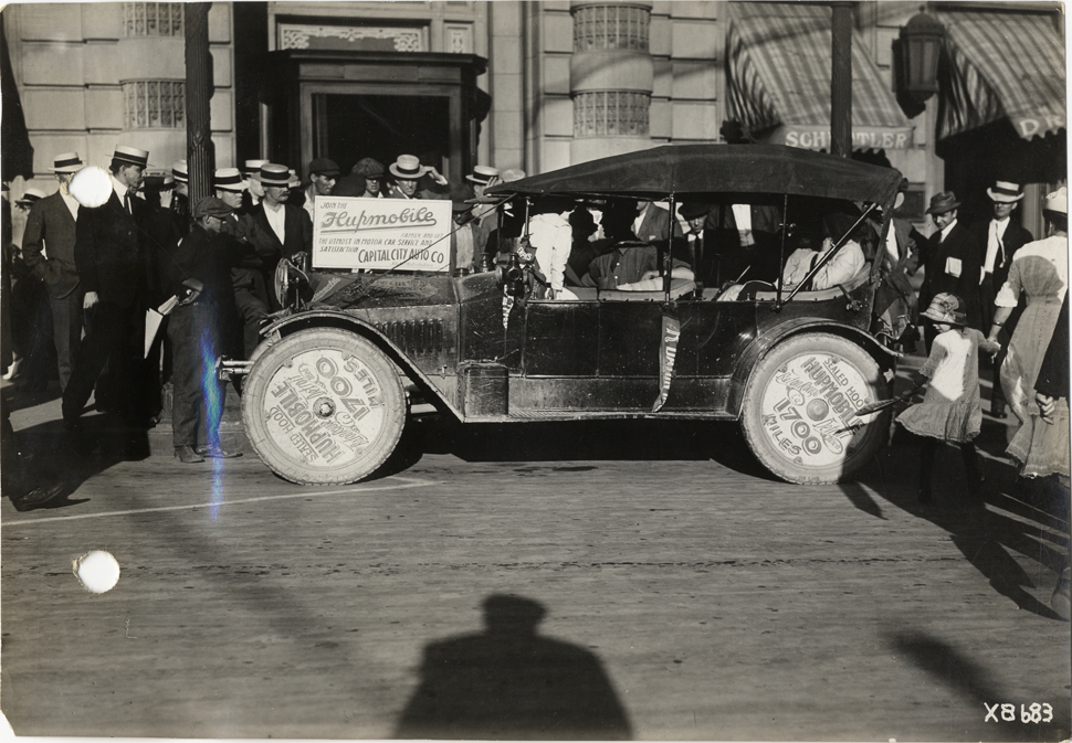 Spectators surrounding Hupmobile automobile at Detroit, Michigan, 1914 Hupmobile Baton Rouge to Detroit tour