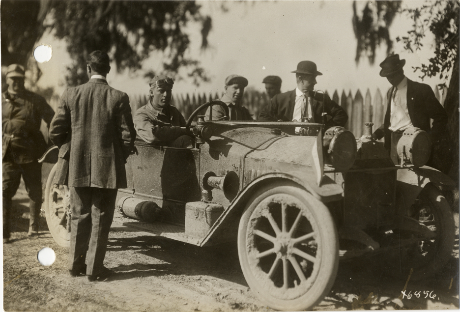 View of spectators surrounding Howard J. Watrous in Hupmobile car near New Orleans, Louisiana during the 1912 Glidden Tour. Although the official 1912 Glidden Tour was canceled, Charles Glidden led a caravan over the identical route that had been originally planned, from Detroit, Michigan to New Orleans, Louisiana. Stamped on back: "Spooner & Wells, Inc., photographers, 1231 Woodward Ave., Detroit, Mich., telephone North 1745." Handwritten on back: "Hupmobile near New Orleans, Glidden Tour, 1912. Tours--Glidden Tour, 1912."
