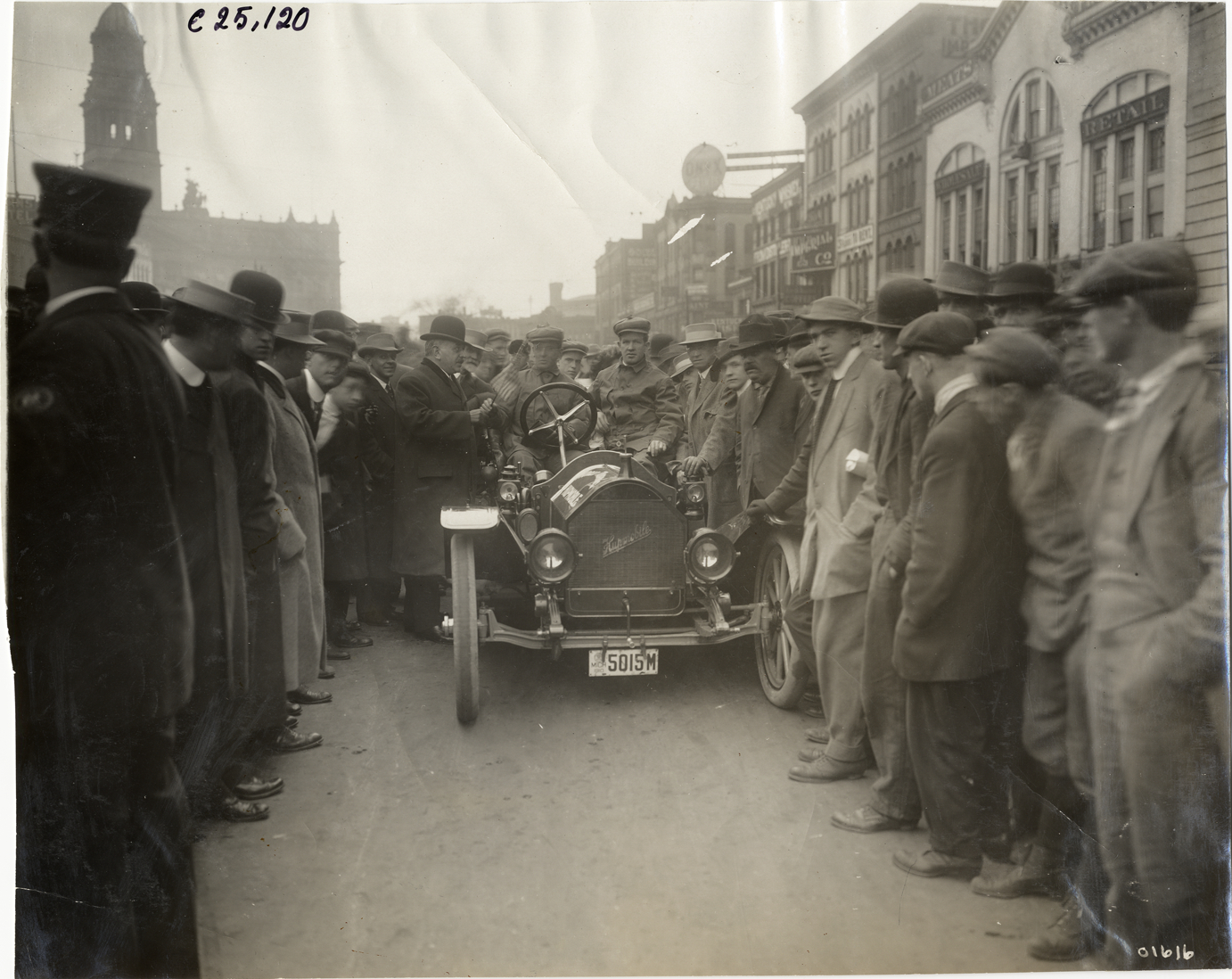 Spectators surrounding motorists in Hupmobile automobile at Detroit, Michigan, 1910 Hupmobile Round the World tour