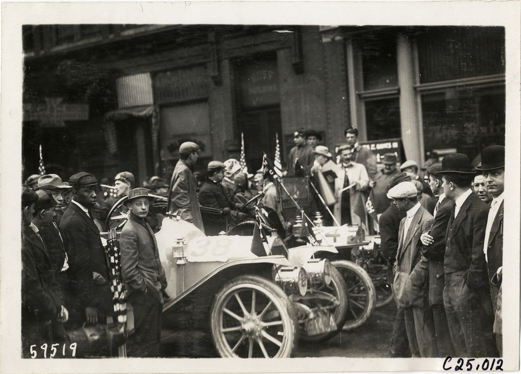 View of spectators surrounding motorists in car no. 38 and car no. 24 during the 1910 Harrisburg Endurance Run. The Motor Club of Harrisburg, Pennsylvania sponsored spring and fall reliability contests which covered routes through Pennsylvania, Maryland and New Jersey. Stamped on back: "Spooner & Wells, Inc., photographers, telephones 3472-3473 Columbus, 1931 Broadway, New York." Handwritten on back: "Tours--Harrisburg Endurance Run, 1910."