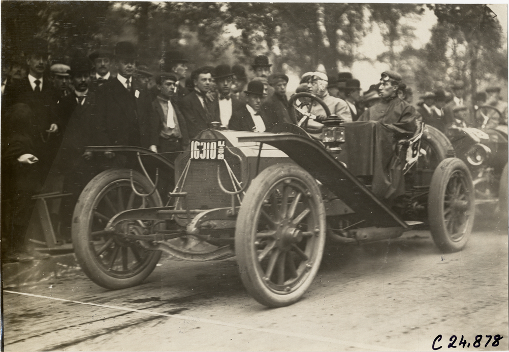 View of motorists in De Dietrich car no. 8 during the 1909 Hackettstown Endurance Run. Spectators in background. Sponsored by the New Jersey Automobile and Motor Club, the endurance run followed a route between Newark and Hackettstown, New Jersey. Handwritten on back: "De Dietrech [sic]. Tours--Hackettstown Endurance Run, 1909."