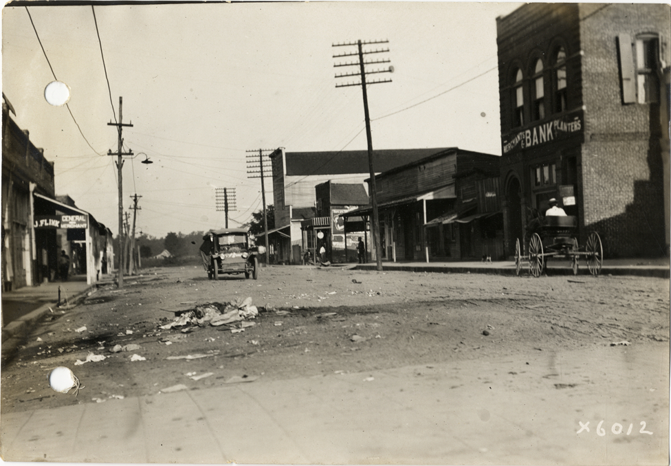 View of Flanders electric car traveling on street at Tchula, Mississippi during the pathfinding expedition for the 1912 Glidden Tour. Bank building on right. The pathfinding tour covered a route from Detroit, Michigan to New Orleans, Louisiana, but the 1912 Glidden Tour was canceled. Stamped on back: "Spooner & Wells, Inc., photographers, 1231 Woodward Ave., Detroit, Mich., telephone North 1745." Handwritten on back: "Pathfinder in Schula [sic], Miss., 1912. Tours--Glidden Tour, 1912."