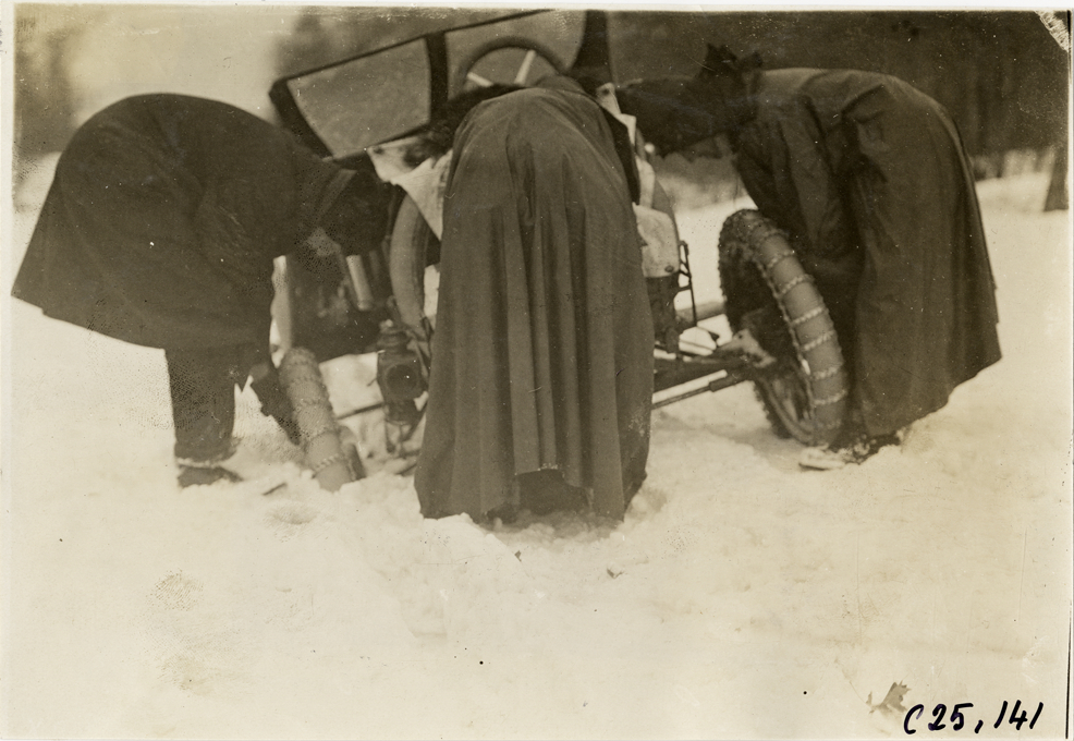 View of three motorists attempting to dislodge Hupmobile car from snow-covered rural road during the 1910 Hupmobile Detroit to New York tour. For this endurance run, the Hupp Motor Company sent three Hupmobiles in early January from Detroit to New York for exhibit at the Grand Central Palace Automobile Show. Stamped on back: "Spooner & Wells, Inc., photographers, telephones 3472-3473 Columbus, 1931 Broadway, New York." Handwritten on back: "Tours--Hupmobile Detroit to New York Tour, 1910."