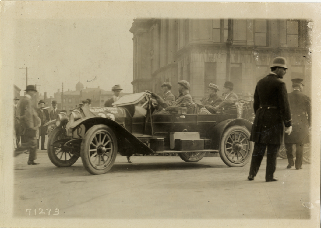 View of motorists in Cole car no. 33 during the 1911 Glidden Tour. Policeman in foreground; spectators in background. Stamped on back: "Spooner & Wells, Inc., photographers, telephones 3472-3473 Columbus, 1931 Broadway, New York." Handwritten on back: "Tours--Glidden Tour, 1911."