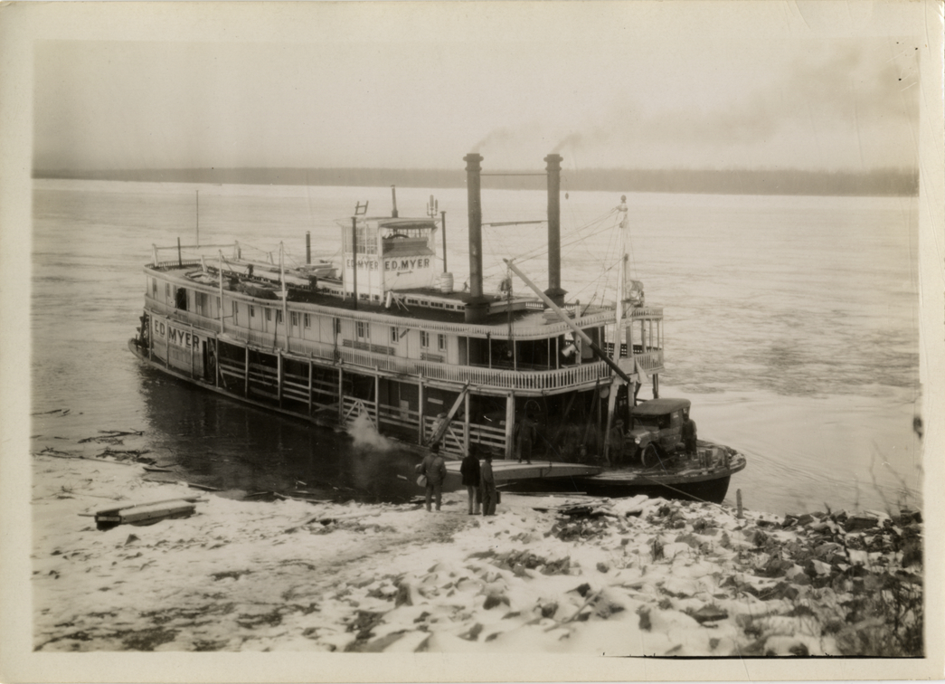 View of Hupmobile car on the deck of the steamboat "Ed Myer" during the Hupmobile United American Tour. The tour was also known as the Hupmobile Capital-to-Capital tour. Three men stand on snow-covered shore. Handwritten on back: "Hupp tour, 1916."