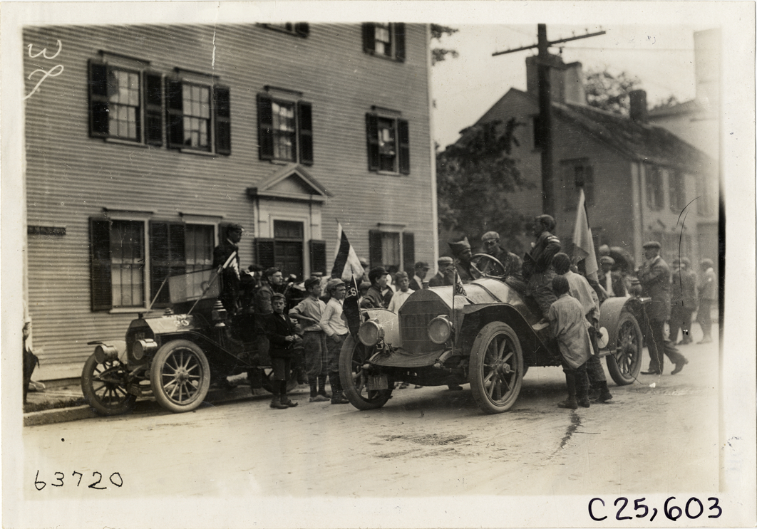 View of spectators surrounding motorists in Ohio car during the 1910 Munsey Historic Tour. E-M-F car and wooden-frame houses in background. Organized by the Munsey newspapers, the endurance contest covered a route through ten states. Stamped on back: "Spooner & Wells, Inc., photographers, telephones 3472-3473 Columbus, 1931 Broadway, New York." Handwritten on back: "Tours--Munsey Historic Tour, 1910."