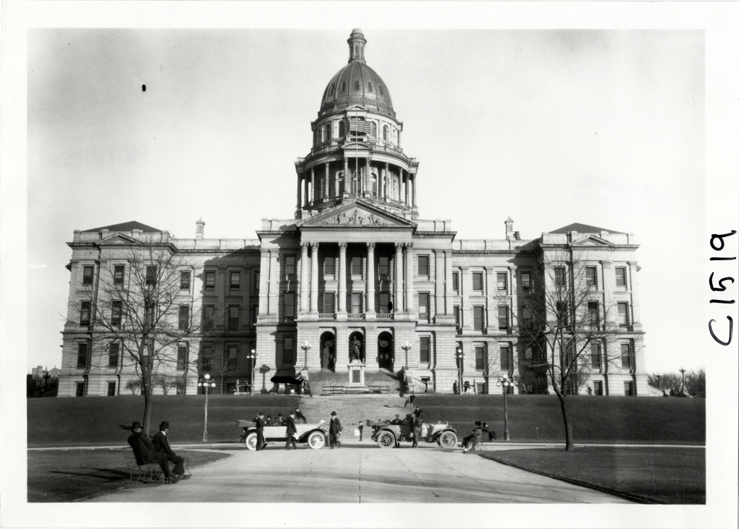 View of motorists with Hupmobile car and another car parked in front of Colorado state capitol building at Denver, Colorado during the Hupmobile United American Tour. The tour was also known as the Hupmobile Capital-to-Capital tour. Handwritten on back: "Hupmobile United America [sic] tour, August 28, 1916 - January 21, 1917. Photo by William H. Krohn. Location: capitol at Denver, Co."