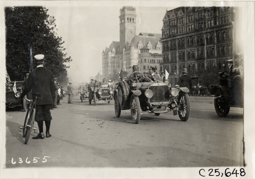 View of motorists in Warren-Detroit car no. 10 and Corbin car traveling on street during the 1910 Munsey Historic Tour. Policeman with bicycle in foreground. Organized by the Munsey newspapers, the endurance contest covered a route through ten states. Stamped on back: "Spooner & Wells, Inc., photographers, telephones 3472-3473 Columbus, 1931 Broadway, New York." Handwritten on back: "Tours--Munsey Historic Tour, 1910."