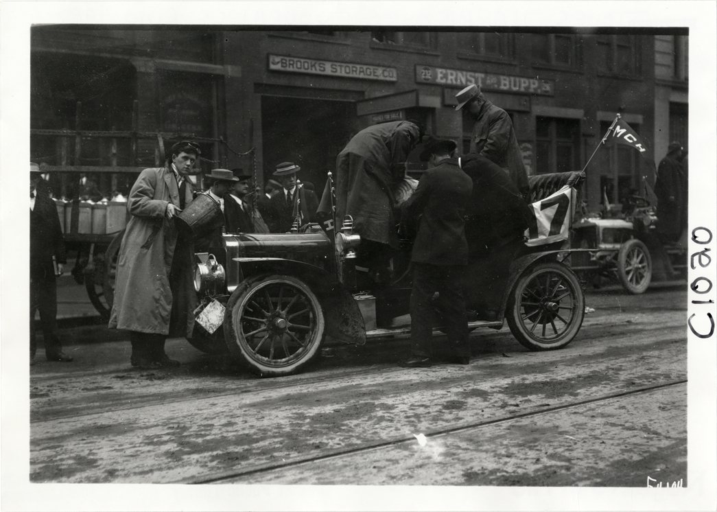 View of motorists adding fluids to car no. 17 during the 1907 Harrisburg Endurance Run. Brooks Storage Co. and Ernst Bupp store in background. Sponsored by the Motor Club of Harrisburg, Pennsylvania, the contest covered routes in Pennsylvania. Handwritten on back: "Tours--Harrisburg Endurance Run, 1907."