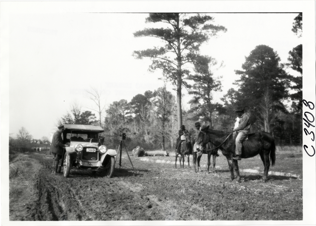 View of motorist with Hupmobile car and three men on horseback on rural dirt road during the Hupmobile United American Tour. Camera on tripod is set up next to car. The tour was also known as the Hupmobile Capital-to-Capital tour. Handwritten on back: "Hupmobile United America [sic] tour, August 28, 1916 - January 21, 1917. Photo by William H. Krohn."