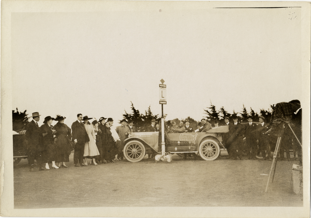 View of motorists and spectators posing with Hupmobile car in front of Lincoln Highway, Western Terminus sign during the Hupmobile United American Tour. Camera on tripod in foreground. The tour was also known as the Hupmobile Capital-to-Capital tour. Stamped on back: "N. Lazarnick, automobile photographer, 246 W. 42nd St., Chicago, N.Y., Detroit." Handwritten on back: "Hupp tour, 1916."
