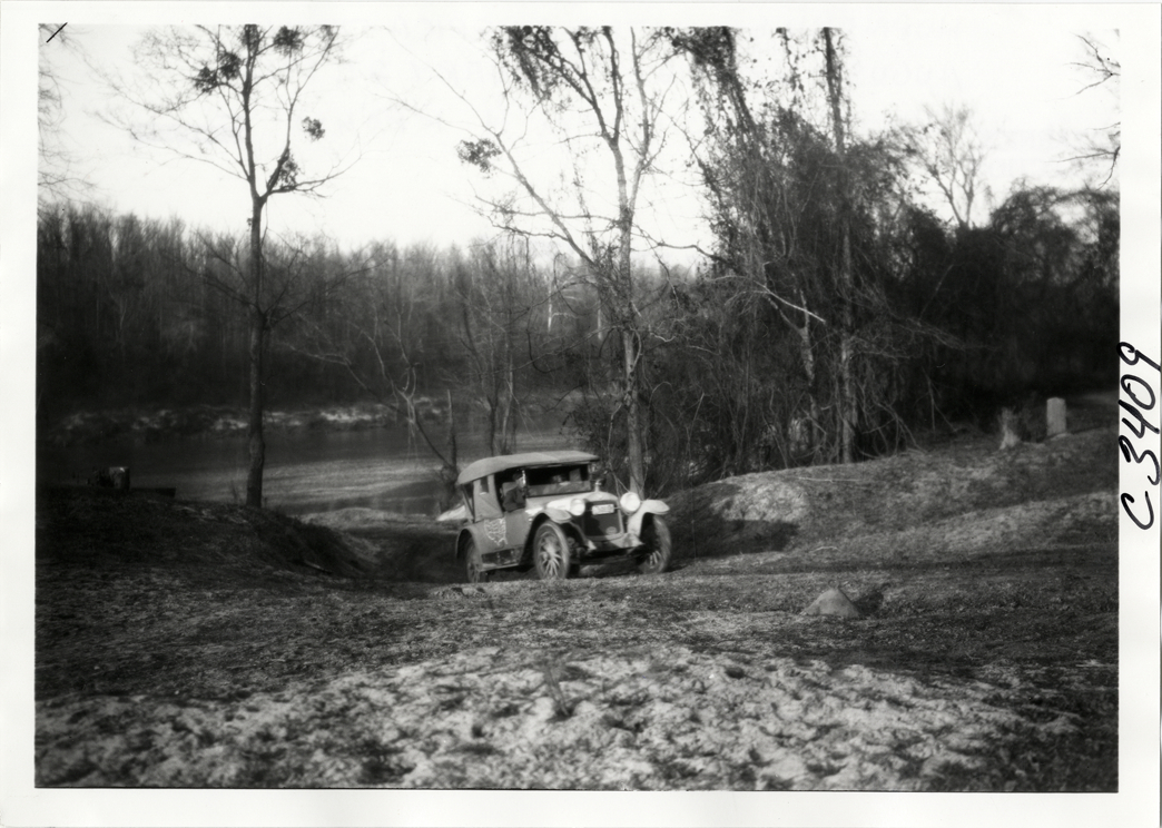 View of Hupmobile car traveling up riverbank during the Hupmobile United American Tour. The tour was also known as the Hupmobile Capital-to-Capital tour. Handwritten on back: "Hupmobile United America [sic] tour, August 28, 1916 - January 21, 1917. Photo by William H. Krohn."