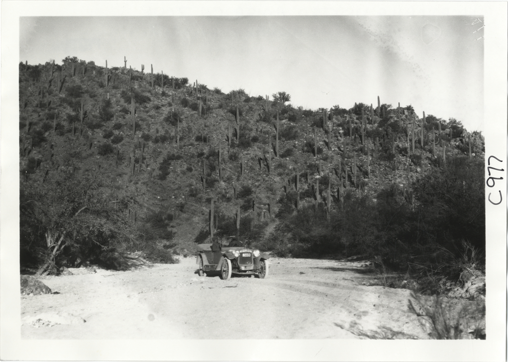 View of motorists in Hupmobile car parked in front of saguaro cacti on hillside during the Hupmobile United American Tour. The tour was also known as the Hupmobile Capital-to-Capital tour. Handwritten on back: "Hupmobile United America [sic] tour, August 28, 1916 - January 21, 1917. Photo by William H. Krohn. Site is Phoenix, Arizona."