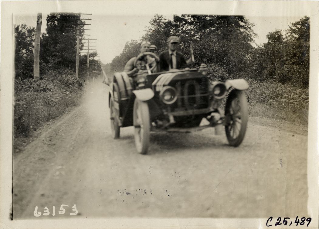 Motorists in Warren-Detroit automobile traveling on rural road, 1910 Munsey Historic Tour