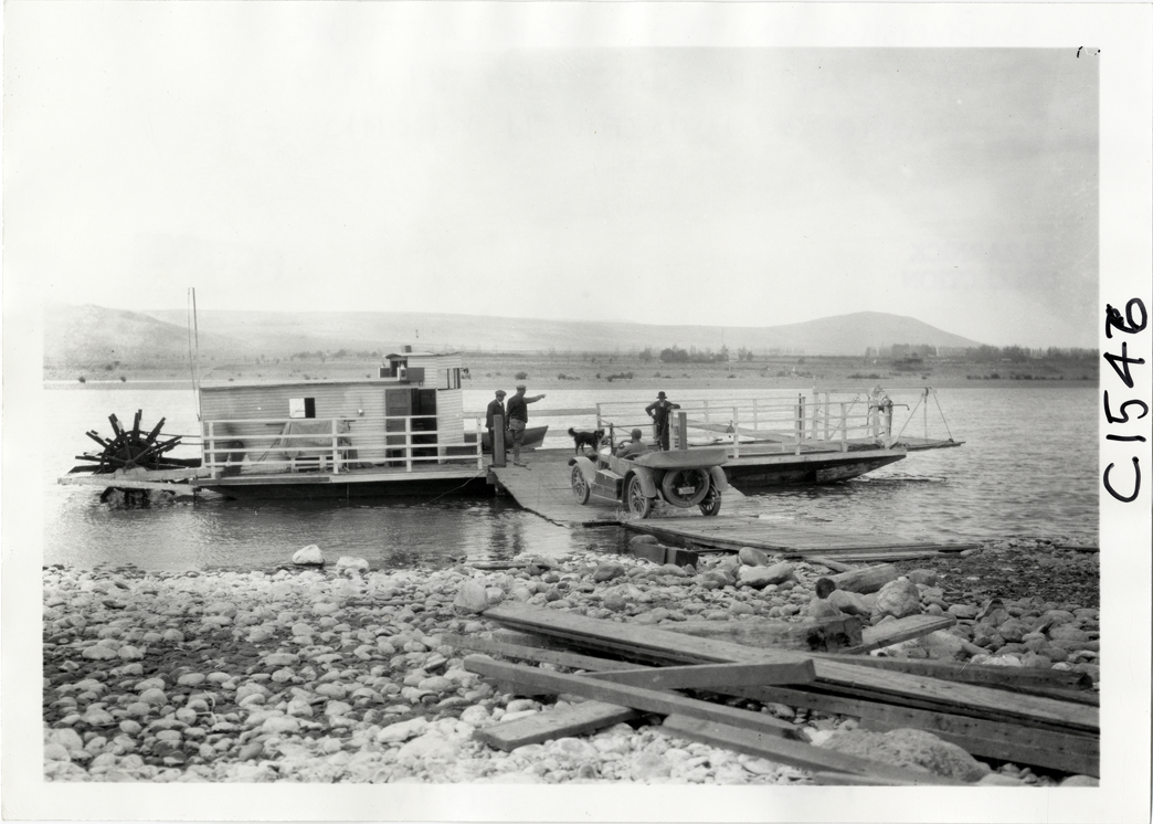 Motorists driving Hupmobile automobile on ramp toward paddle-wheel ferry, Hupmobile United American Tour
