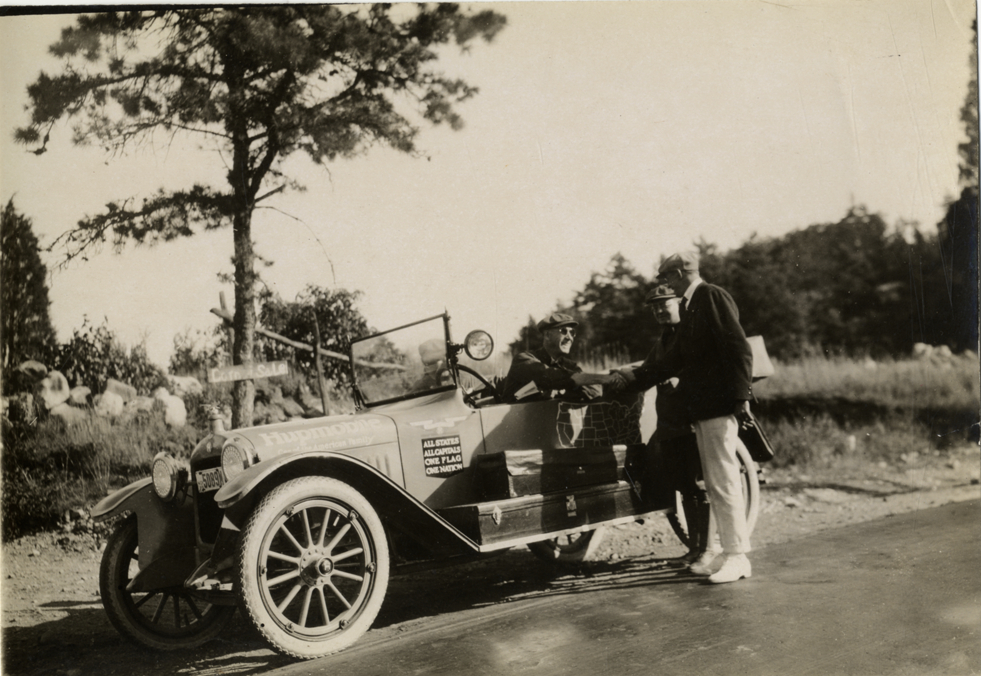 Man shaking hands with driver of Hupmobile automobile on rural road, Hupmobile United American Tour