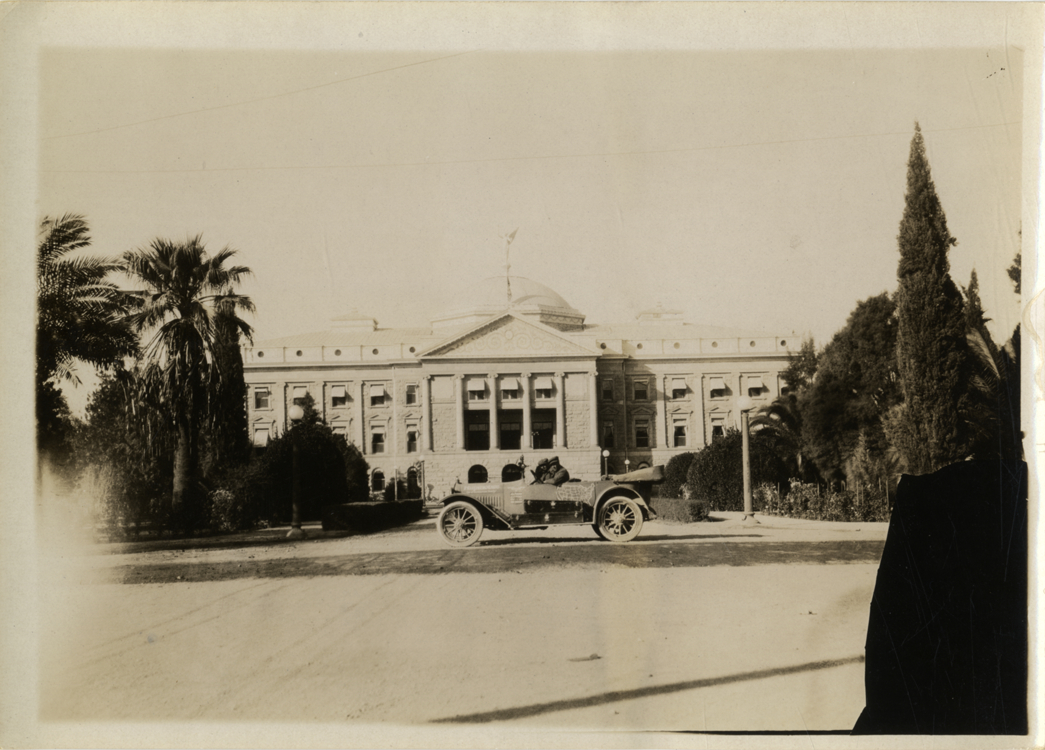 View of motorists in Hupmobile car in front of the Arizona state capitol building in Phoenix, Arizona during the Hupmobile United American Tour. The tour was also known as the Hupmobile Capital-to-Capital tour. Handwritten on back: "Hupp tour, 1916."