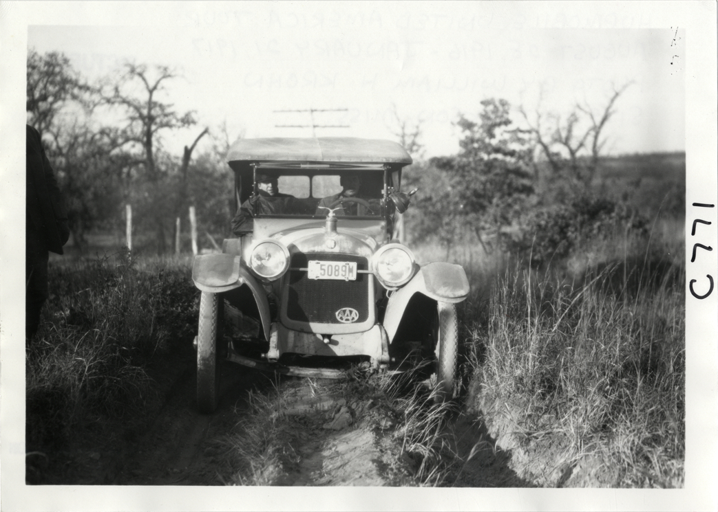 View of motorists in Hupmobile car traveling on rutted rural dirt road in Jackson, Mississippi during the Hupmobile United American Tour. The tour was also known as the Hupmobile Capital-to-Capital tour. Handwritten on back: "Hupmobile United America [sic] tour, August 28, 1916 - January 21, 1917. Photo by William H. Krohn. Site is Jackson, Miss."