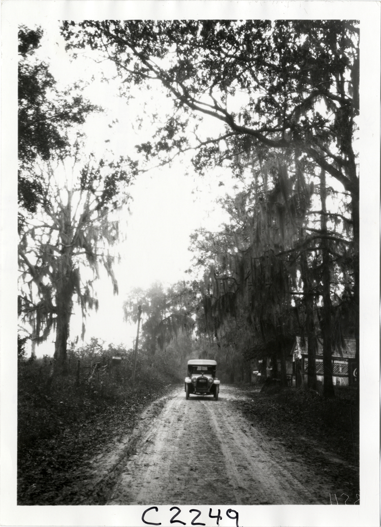 View of Hupmobile car traveling on rural dirt road during the Hupmobile United American Tour. The tour was also known as the Hupmobile Capital-to-Capital tour. Handwritten on back: "Hupmobile United America [sic] tour, August 28, 1916 - January 21, 1917. Photo by William H. Krohn."