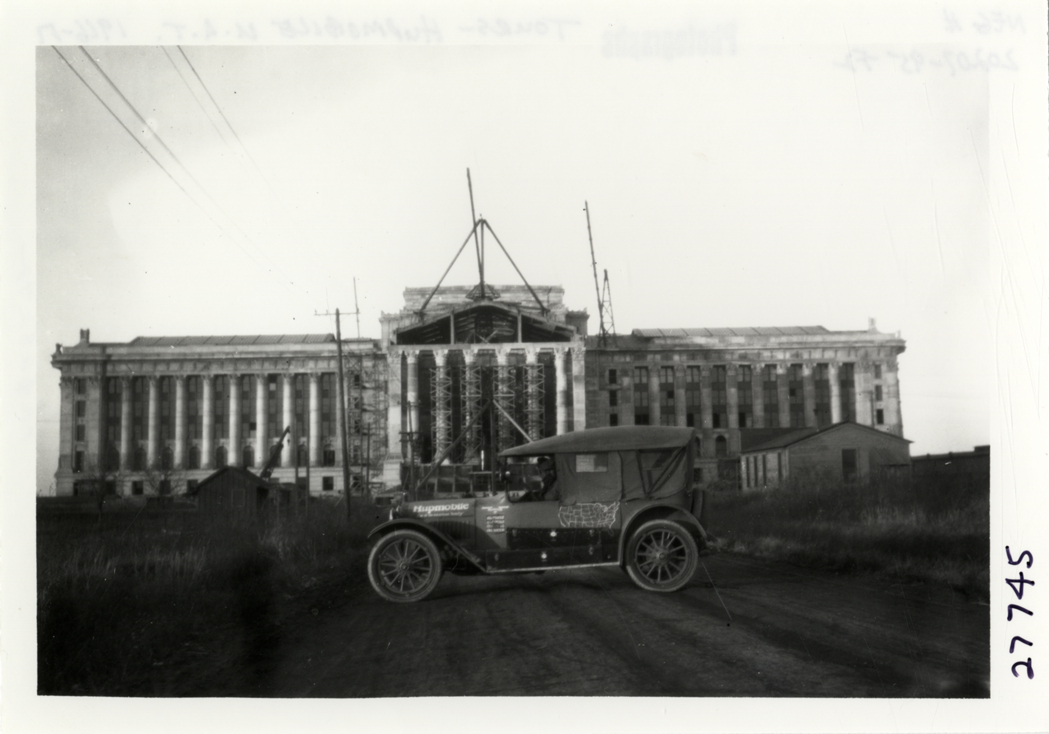 Hupmobile automobile parked in front of Oklahoma capitol building under construction, Hupmobile United American Tour