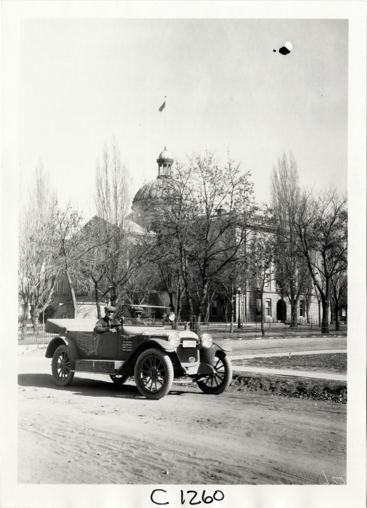 Hupmobile automobile parked in front of New Mexico state capitol building, Hupmobile United American Tour