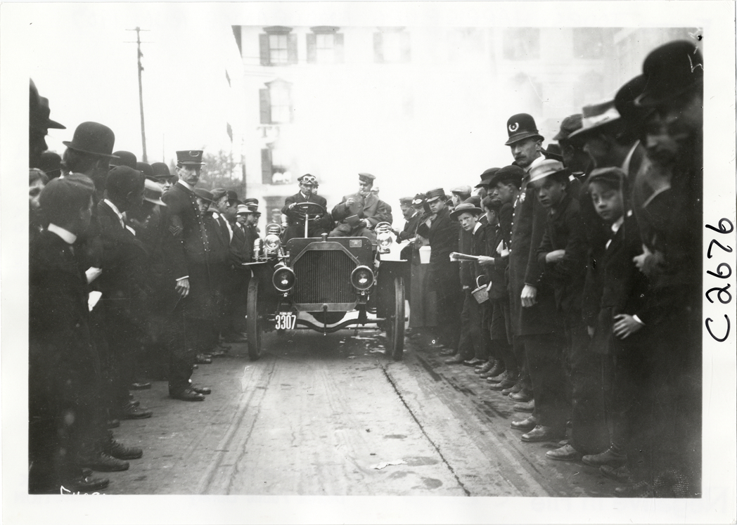Spectators surrounding motorists in automobile at Harrisburg, Pennsylvania, 1907 Harrisburg Endurance Run