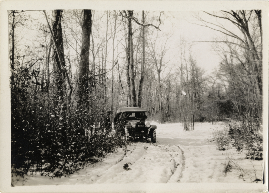 Hupmobile automobile traveling on snow-covered road, Hupmobile United American Tour