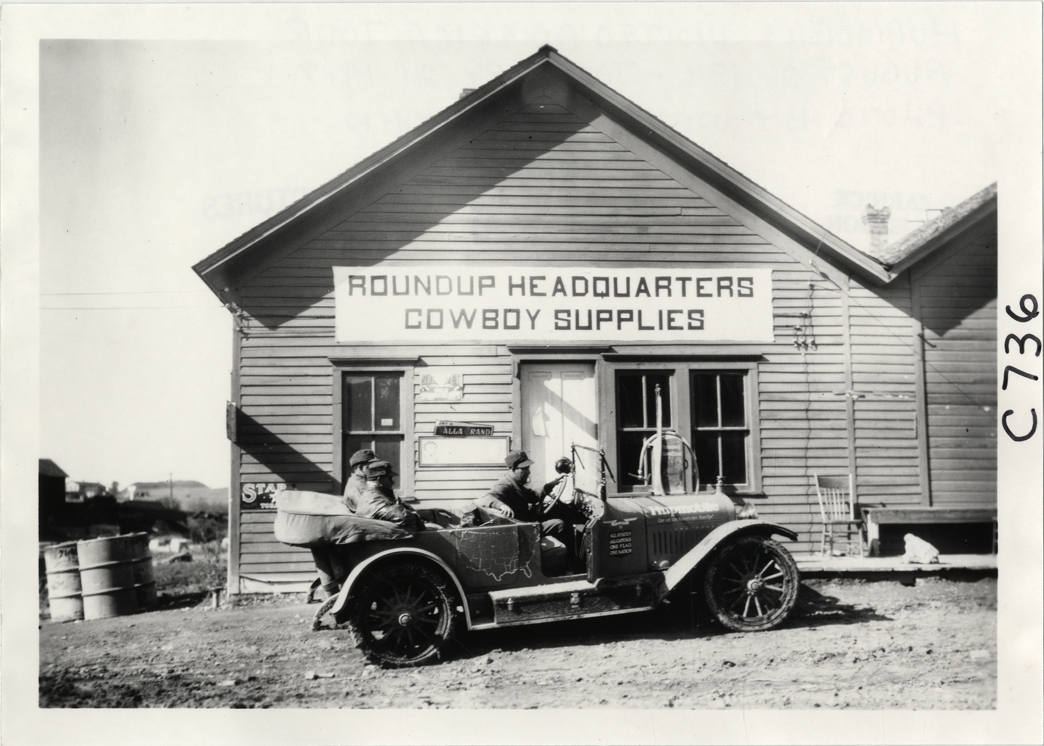 Motorists in Hupmobile automobile in front of Roundup Headquarters Cowboy Supplies, Hupmobile United American Tour