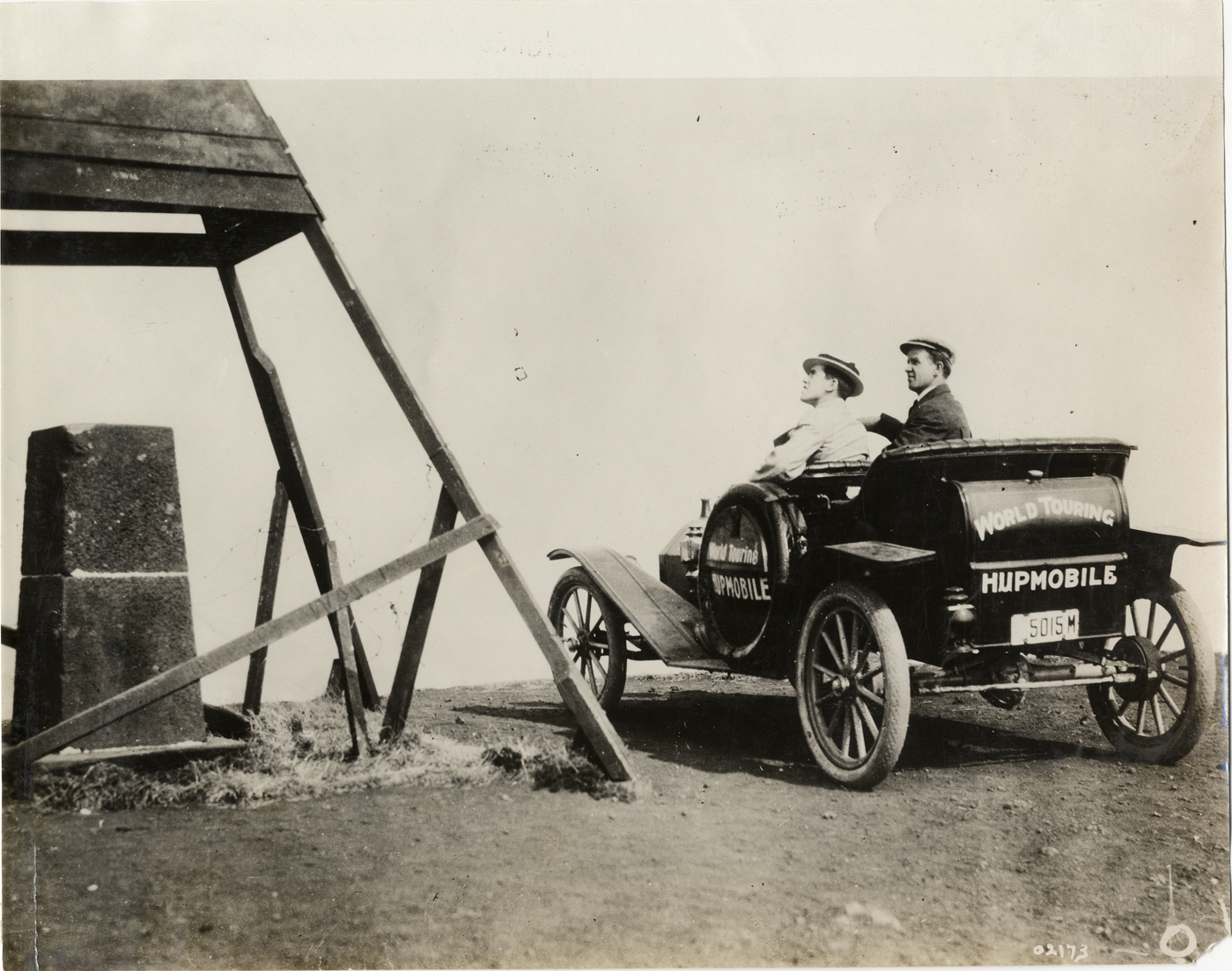 Rear view of driver and passenger in Hupmobile car in New Zealand during the 1910 Hupmobile Round the World tour. The expedition, which left from Detroit, Michigan, was a demonstration of Hupmobile efficiency throughout the U.S., Hawaii, the Fiji Islands and New Zealand. Handwritten on back: "World tour car in New Zealand. Tours--Hupmobile Round the World Tour, 1910."
