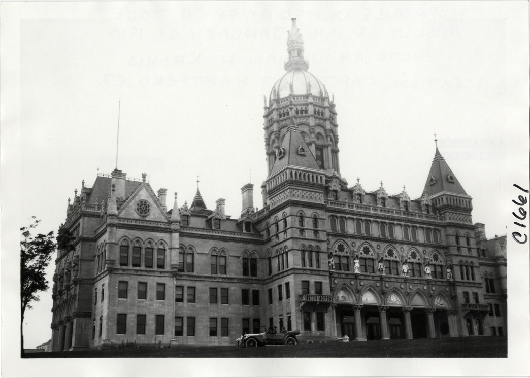 View of motorists in Hupmobile car parked in front of Connecticut state capitol building at Hartford, Connecticut during the Hupmobile United American Tour. The tour was also known as the Hupmobile Capital-to-Capital tour. Handwritten on back: "Hupmobile United America [sic] tour, August 28, 1916 - January 21, 1917. Photo by William H. Krohn. Location: capitol at Hartford, Ct."