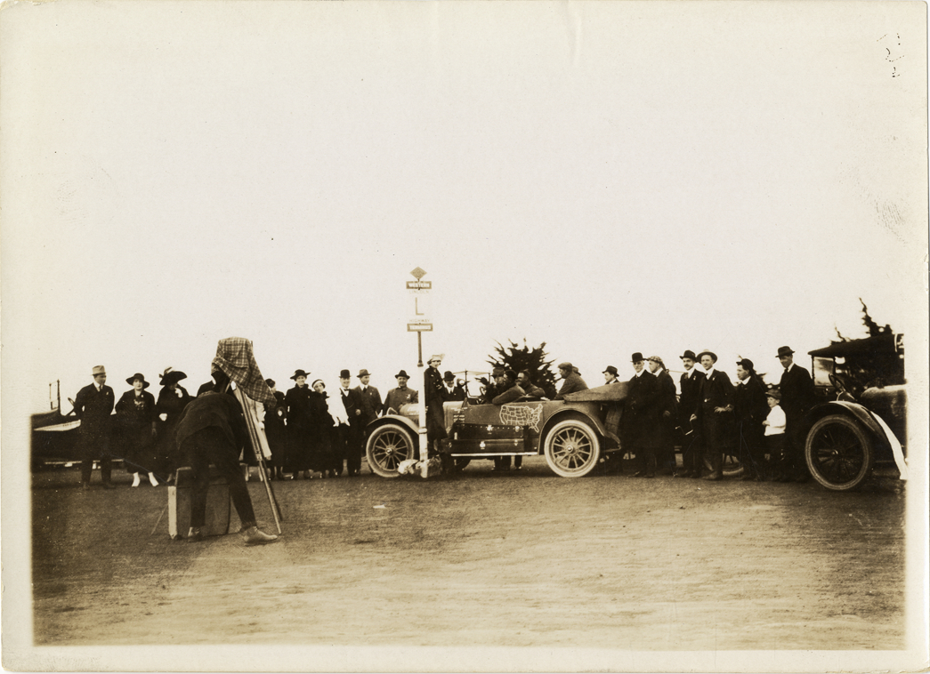 View of motorists and spectators posing with Hupmobile car in front of Lincoln Highway, Western Terminus sign during the Hupmobile United American Tour. Camera on tripod in foreground. The tour was also known as the Hupmobile Capital-to-Capital tour. Handwritten on back: "Hupp tour, 1916."