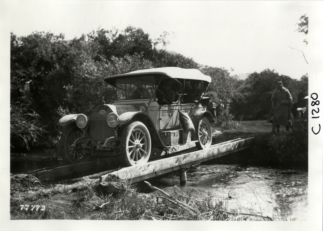 Motorists in Haynes automobile crossing bridge, 1913 Indiana Automobile Manufacturers' Association tour