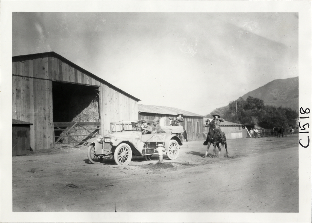View of cowboys on horseback approaching Hupmobile car in front of barn during the Hupmobile United American Tour. The tour was also known as the Hupmobile Capital-to-Capital tour. Handwritten on back: "Hupmobile United America [sic] tour, August 28, 1916 - January 21, 1917. Photo by William H. Krohn."
