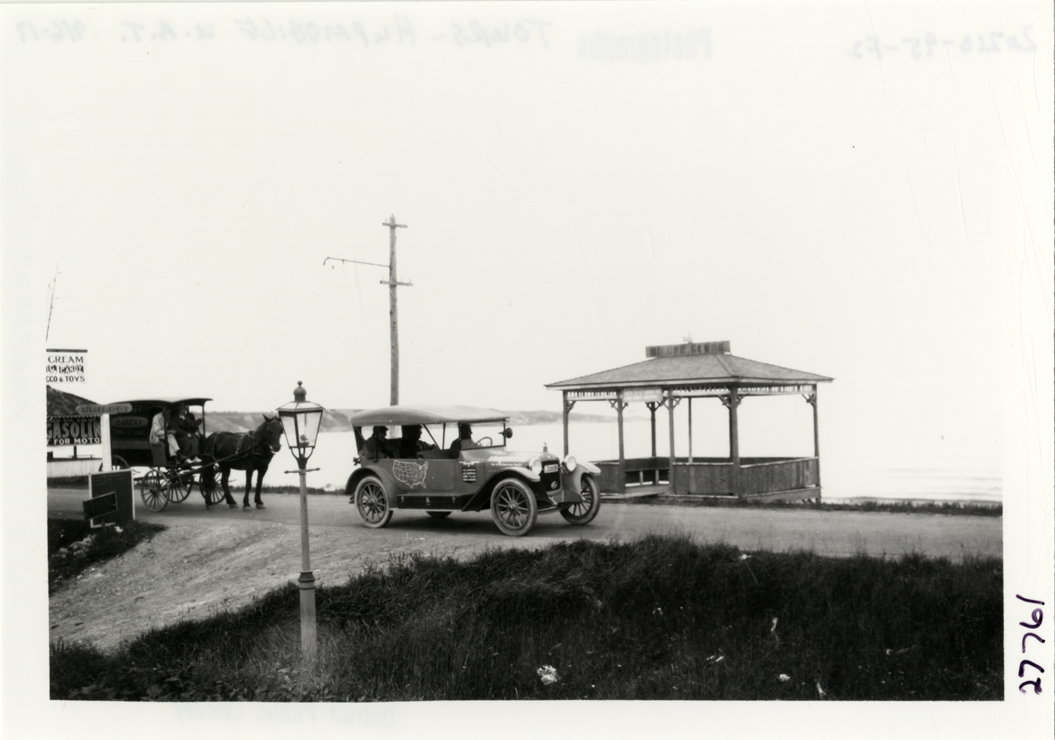 View of motorists in Hupmobile car parked in front of gazebo on lakeshore during the Hupmobile United American Tour. Horse-drawn wagon on left; lamppost in foreground. The tour was also known as the Hupmobile Capital-to-Capital tour. Handwritten on back: "Tours--Hupmobile U.A.T. 1916-17."