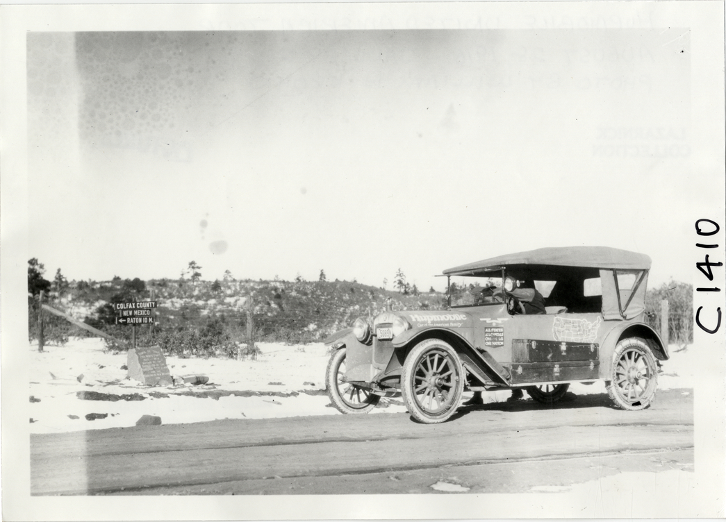 View of Hupmobile car on dirt road in Colfax County, New Mexico during the Hupmobile United American Tour. Historical marker for Santa Fe Trail and "Colfax County, New Mexico, Raton, 10 m." sign on roadside. The tour was also known as the Hupmobile Capital-to-Capital tour. Handwritten on back: "Hupmobile United America [sic] tour, August 28, 1916 - January 21, 1917. Photo by William H. Krohn."