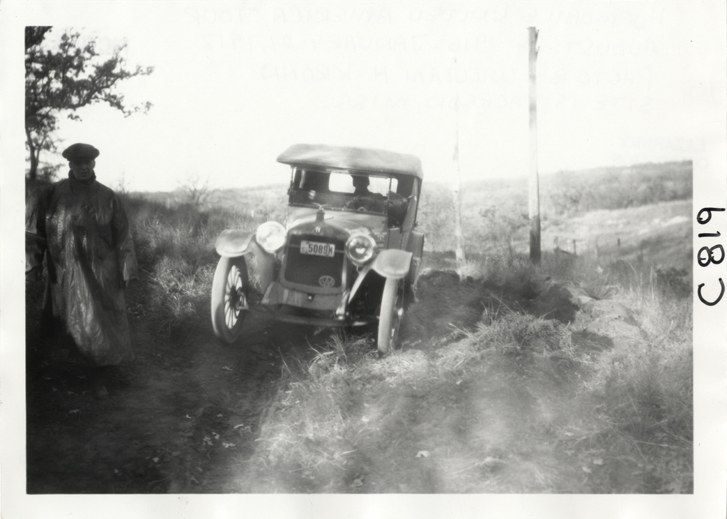 View of motorists in Hupmobile car traveling on rutted rural dirt road in Jackson, Mississippi during the Hupmobile United American Tour. The tour was also known as the Hupmobile Capital-to-Capital tour. Handwritten on back: "Hupmobile United America [sic] tour, August 28, 1916 - January 21, 1917. Photo by William H. Krohn. Site is Jackson, Miss."