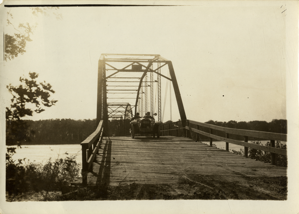 Motorists in Hupmobile automobile crossing bridge, Hupmobile United American Tour
