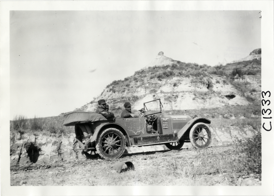 View of motorists in Hupmobile car on desert road during the Hupmobile United American Tour. The tour was also known as the Hupmobile Capital-to-Capital tour. Handwritten on back: "Hupmobile United America [sic] tour, August 28, 1916 - January 21, 1917. Photo by William H. Krohn."