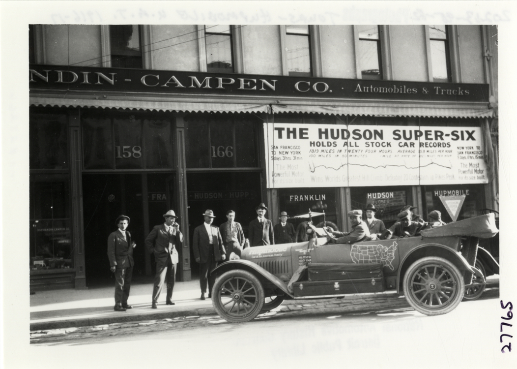 View of motorists in Hupmobile car parked in front of Normandin-Campen Co. automobile dealership at San Jose, California during the Hupmobile United American Tour. Banner advertising the Hudson Super-Six car is displayed on windows; spectators stand on sidewalk. The tour was also known as the Hupmobile Capital-to-Capital tour. Handwritten on back: "Tours--Hupmobile U.A.T. 1916-17."