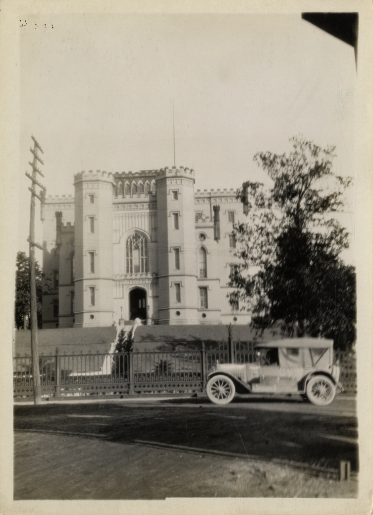 View of Hupmobile car parked in front of Gothic Revival building during the Hupmobile United American Tour. Stone building has castellated roof and stained glass window. The tour was also known as the Hupmobile Capital-to-Capital tour. Handwritten on back: "Hupp tour, 1916."