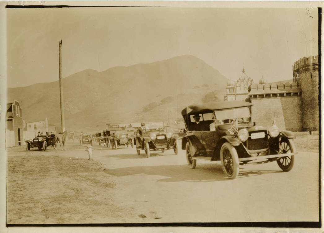 View of Hupmobile car leading several cars through town during the Hupmobile United American Tour. Mountains in background. The tour was also known as the Hupmobile Capital-to-Capital tour. Stamped on back: "N. Lazarnick, automobile photographer, 246 W. 42nd St., Chicago, N.Y., Detroit." Handwritten on back: "Hupp tour, 1916."