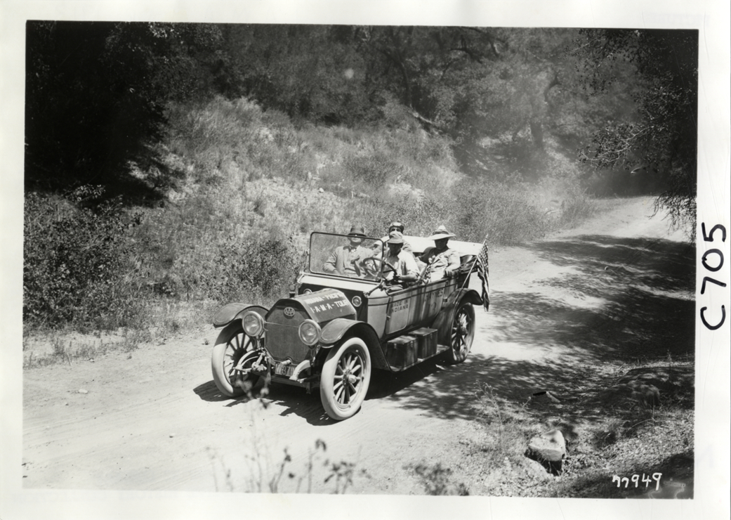 View of motorists in Haynes car no. 13 traveling on rural road during the 1913 transcontinental tour organized by Indiana Automobile Manufacturers' Association. Car is decorated with an American flag. Handwritten on back: "Haynes, no. 13, W.J. Morgan, T.L. Tincher, George Strout, F.R. Wagner. Photo by Spooner & Wells. Tours--I.A.M.A, 1913."