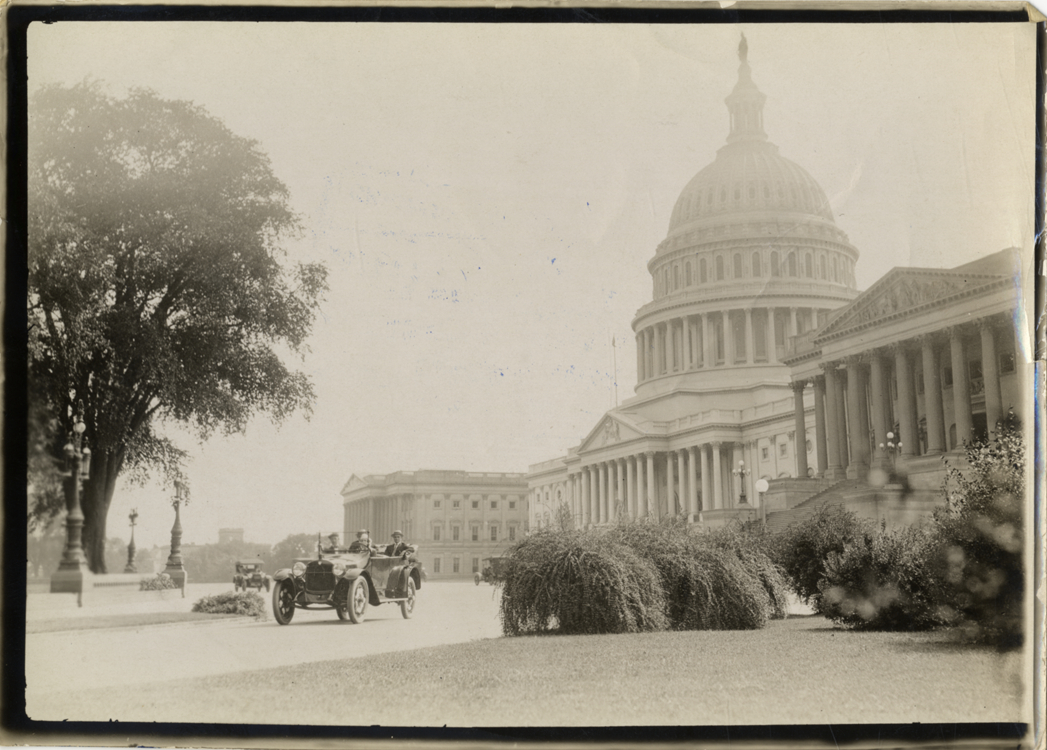 View of motorists in Hupmobile car in front of U.S. Capitol building at Washington, D.C. during the Hupmobile United American Tour. The tour was also known as the Hupmobile Capital-to-Capital tour. Stamped on back: "N. Lazarnick, automobile photographer, 246 W. 42nd St., Chicago, N.Y., Detroit." Handwritten on back: "Hupp tour, 1916."
