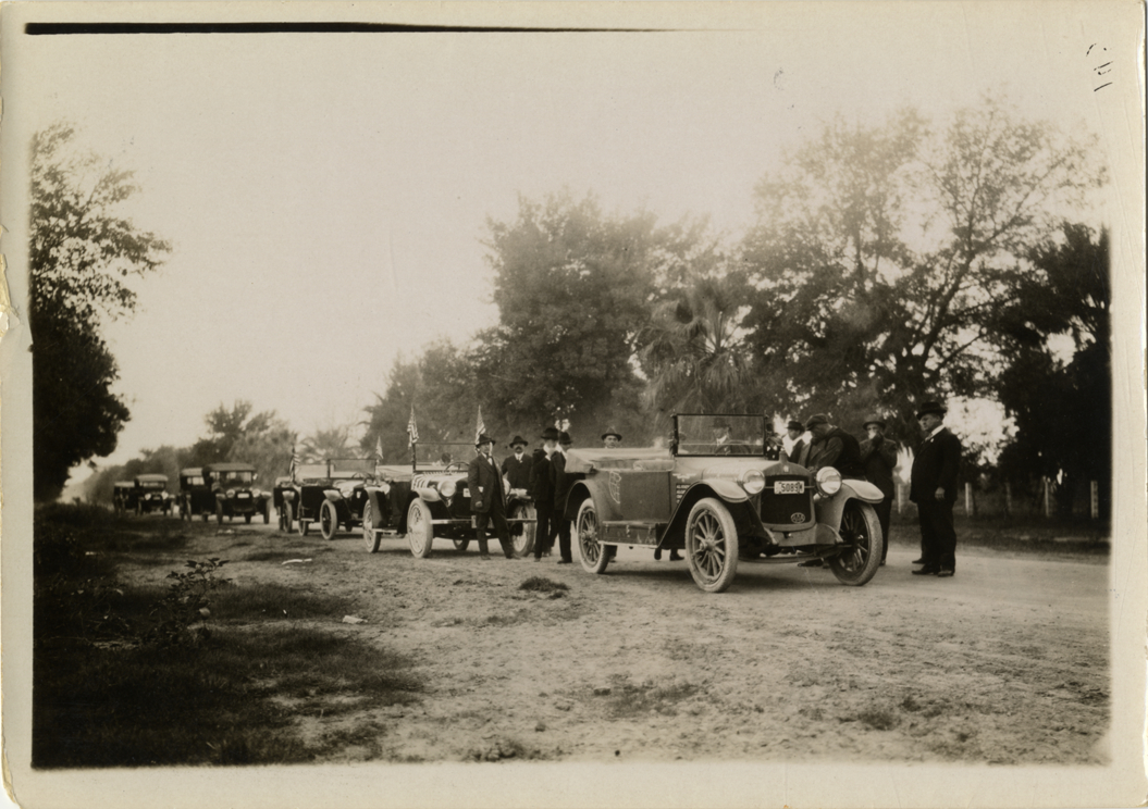 Hupmobile automobile and other automobiles lined up in road, Hupmobile United American Tour