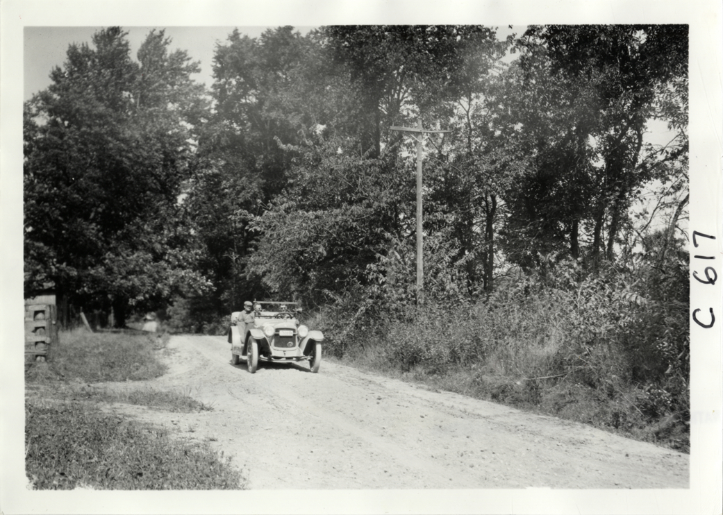 Motorists in Hupmobile automobile traveling on rural road, Hupmobile United American Tour