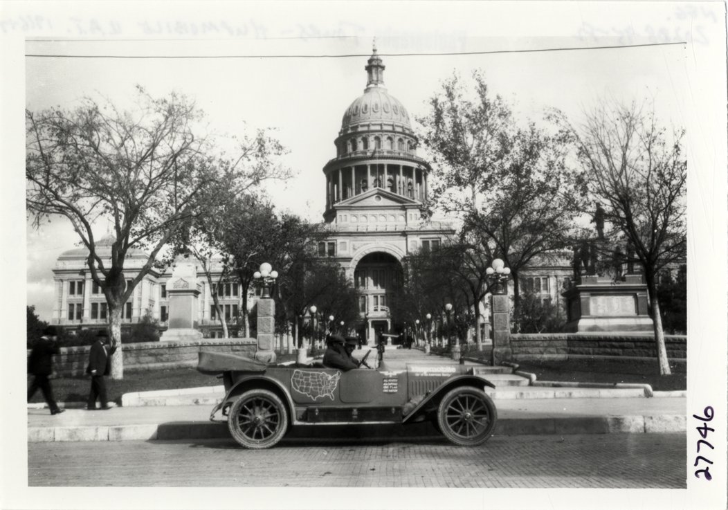 Motorists in Hupmobile automobile parked in front of Texas state capitol building, Hupmobile United American Tour