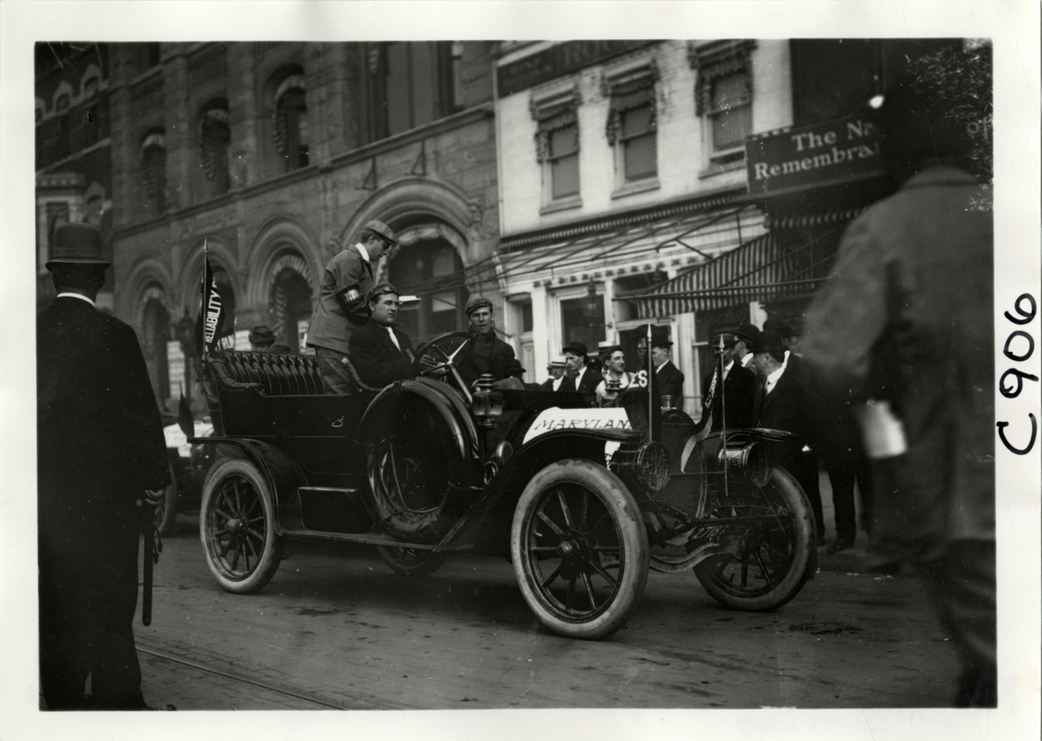 View of motorists in Maryland car no. 11 at Washington, D.C. during the 1909 Munsey Reliability Run. Spectators and commercial buildings in background. Handwritten on back: "Maryland #11, Sinclair-Scott Co., Baltimore, MD. Tours--Munsey Reliability Run, 1909."