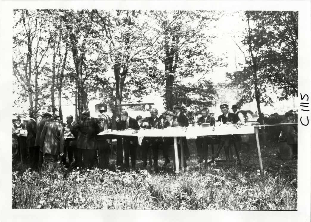 Motorists eating at picnic tables, 1910 Long Island Endurance Run