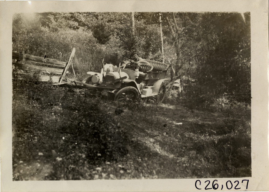 Automobile in ditch on roadside, 1909 Munsey Reliability Run